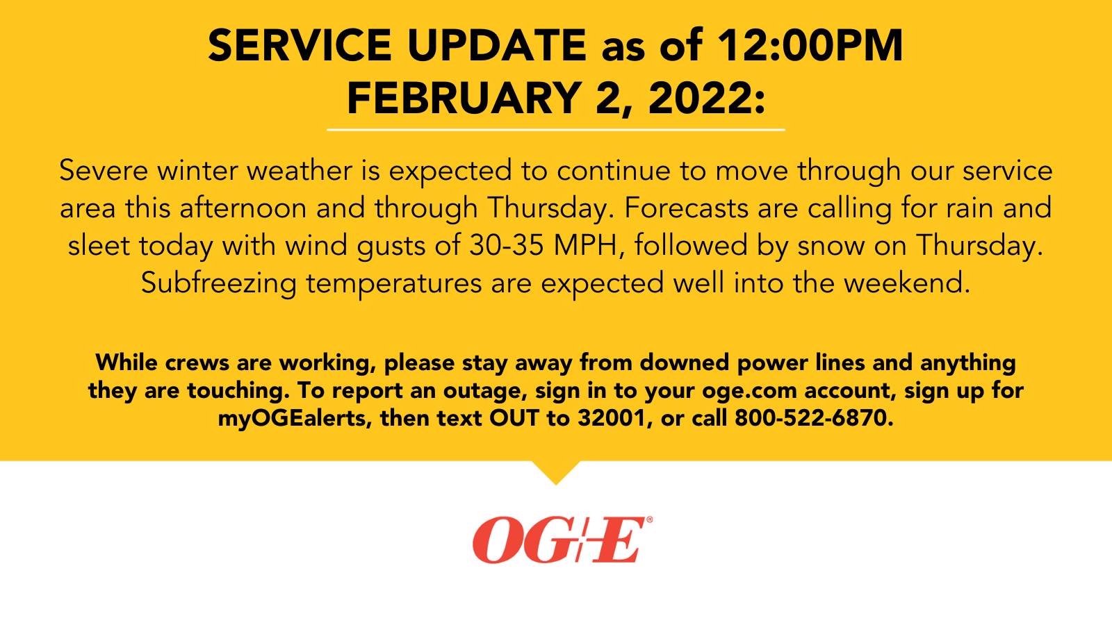 Og E On Twitter Service Update As Of 12 00pm February 2 2022 Severe Winter Weather Is Expected To Continue To Move Through Our Service Area This Afternoon And Through Thursday Https T Co Sfrtdz8oan Twitter